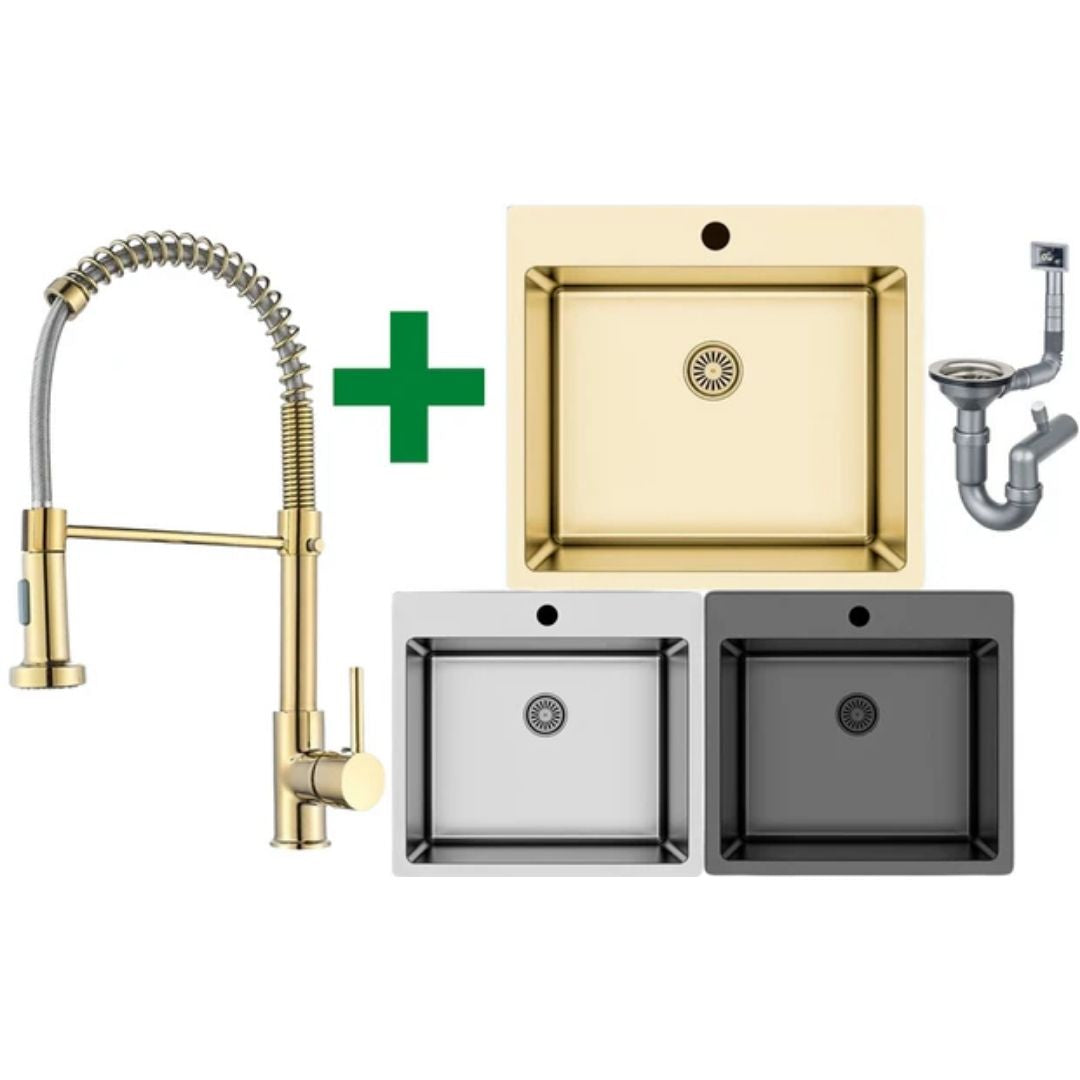 Edelstahlspüle 50,5 x 55 in verschiedenen Farben + Spiral Gold Armatur + Siphon-Set inklusive