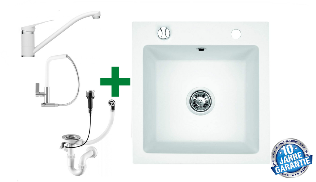 Granitspüle 48x50 Weiß + Armatur + Siphon