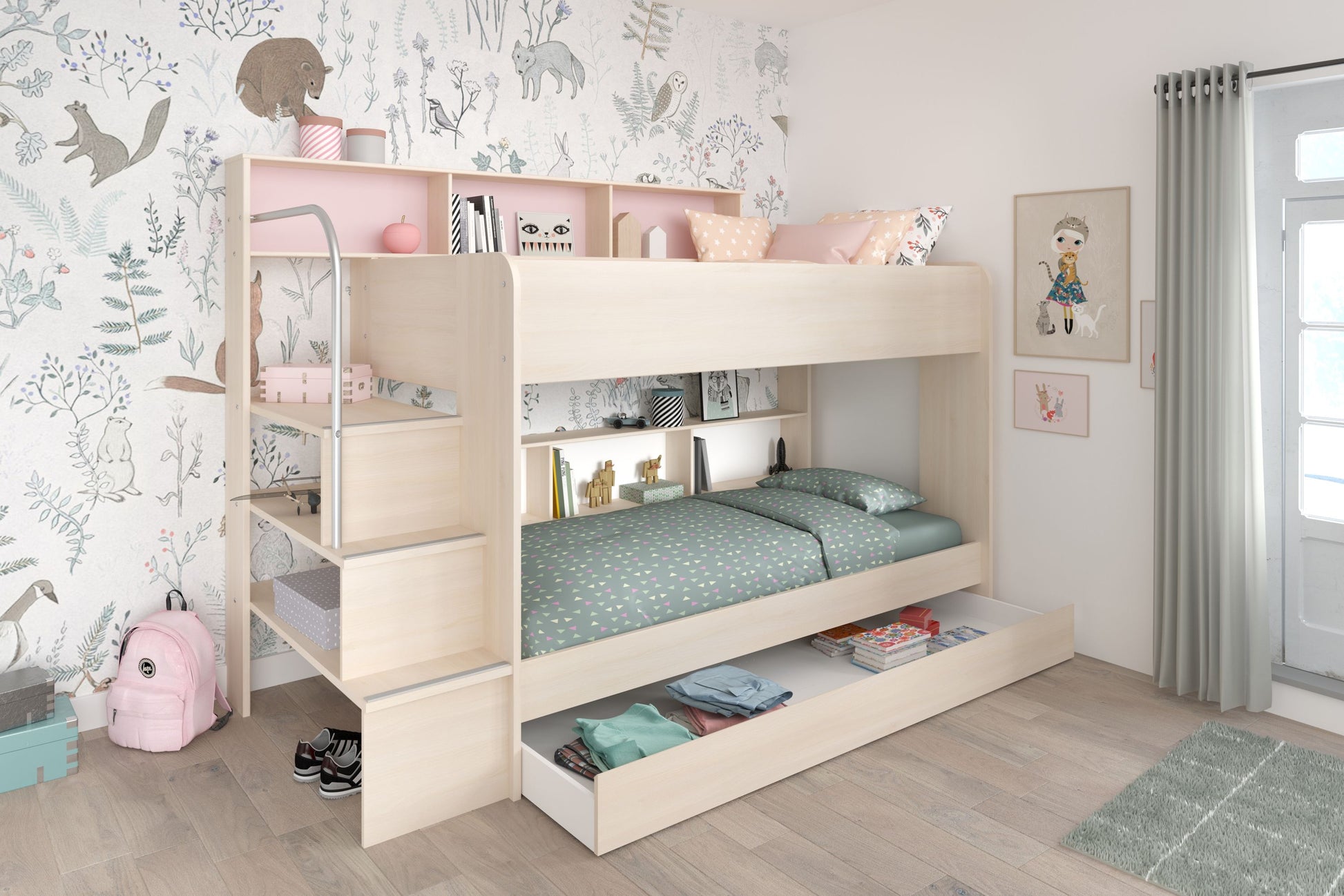 Mit dem Etagenbett Bibop von Parisot werden Sie bei Ihren Kindern mit Sicherheit punkten. Dieses moderne und praktische Etagenbett aus Holz ist zusätzlich ein aufregender Spielplatz. Das Angebot umfasst das Hochbett inklusive 2 belüfteter Auflageplatten für die Matratzen, einer Stufenleiter inklusive Handlauf / Geländer und vielen Ablagefächern / Regal an der Rückseite des Bettes. Die optimale Lösung speziell auch für kleinere Kinderzimmer oder wenn 2 Kids sich ein Kinderzimmer teilen. Das Highlight an dem Hochbett ist der Bettschubkasten, der als 3. Liegefläche genutzt werden kann. Durch Bestellung der passenden Matratze in blau oder pink runden Sie die ganze Sache dann noch ab. Jetzt fragt sich nur noch, wer oben und wer unten schläft.