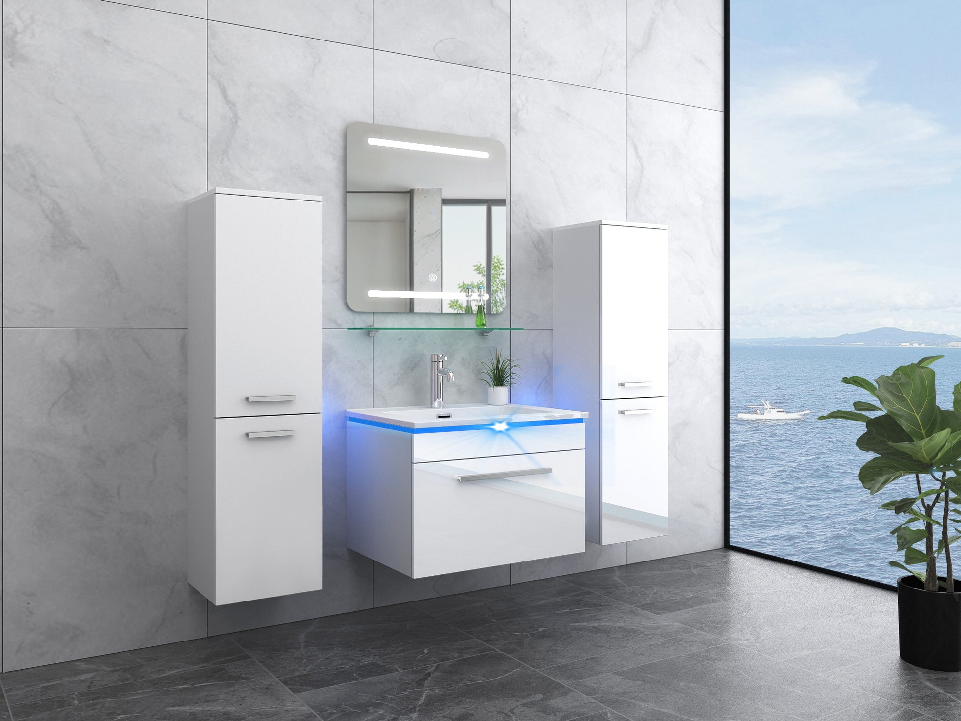Das Set umfasst einen LED-Spiegel mit Touch-Funktion, einen Waschtischunterschrank mit Soft-Close-Mechanismus sowie zwei praktische Seitenschränke, die zusätzlichen Stauraum für Handtücher, Pflegeprodukte und Badaccessoires bieten. Das robuste Keramik-Waschbecken ist besonders pflegeleicht, langlebig und ideal für den täglichen Gebrauch.