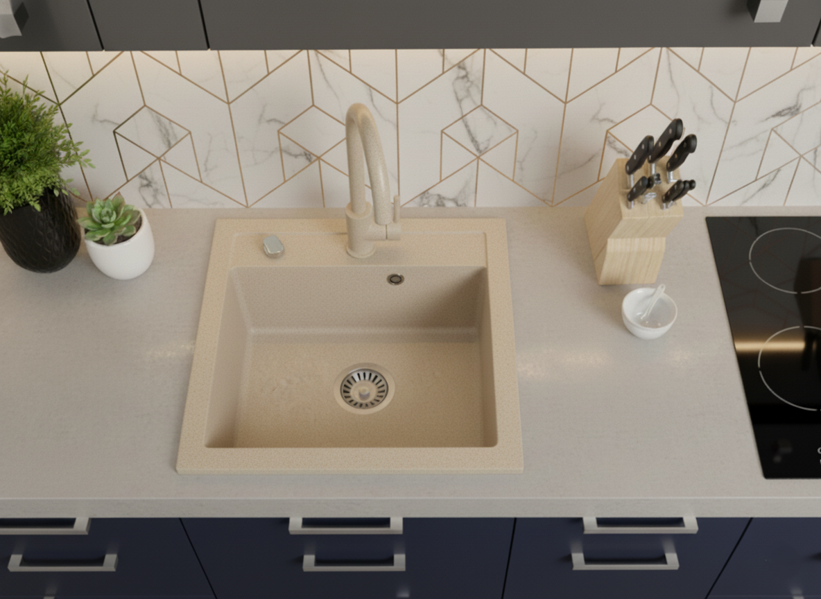Hergestellt in Europa, steht diese Granitspüle für hohe Qualität, Langlebigkeit und funktionales Design.