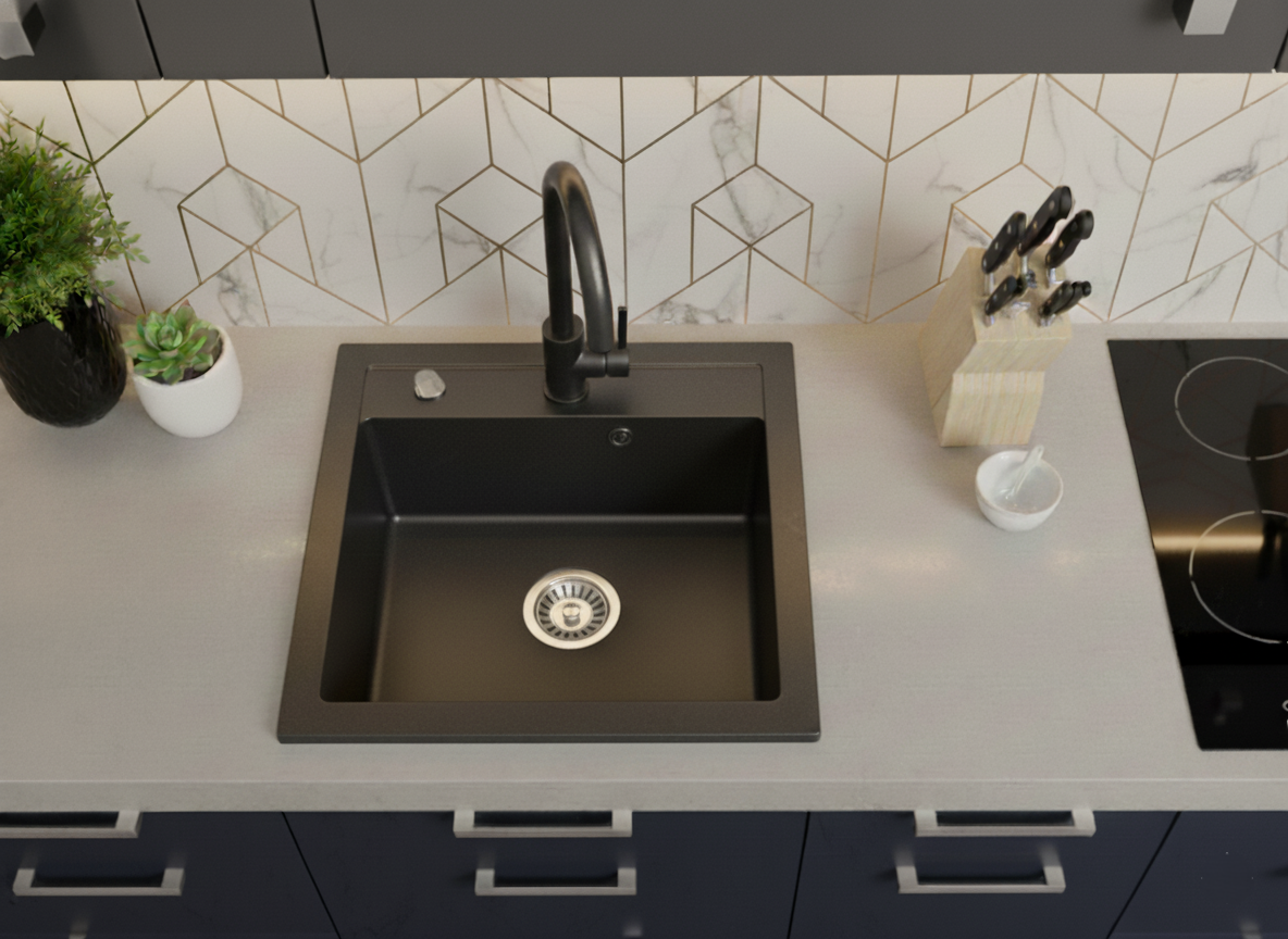 Granitspüle 49x52 cm – Milano Einbauspüle, reversibel montierbar, inkl. Siphon