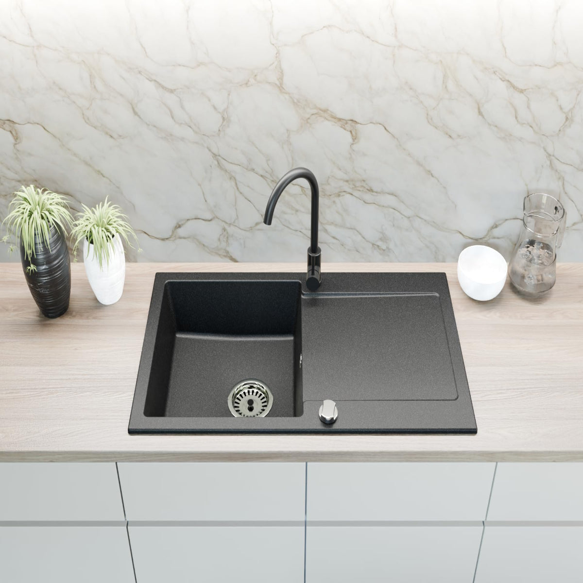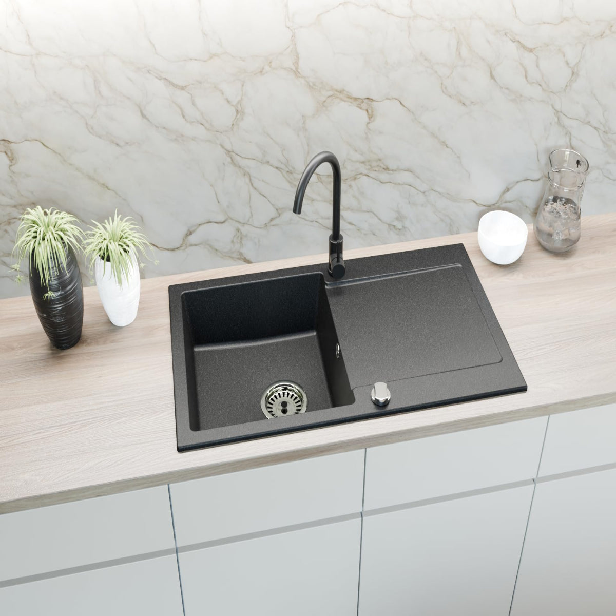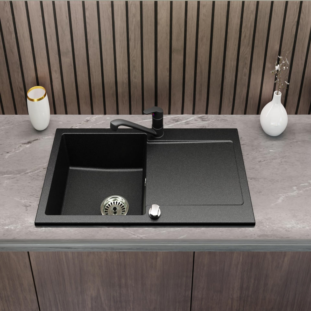 - 1 × Granitspüle „Element“ Schwarz Gesprenkelt (900 × 500 mm)