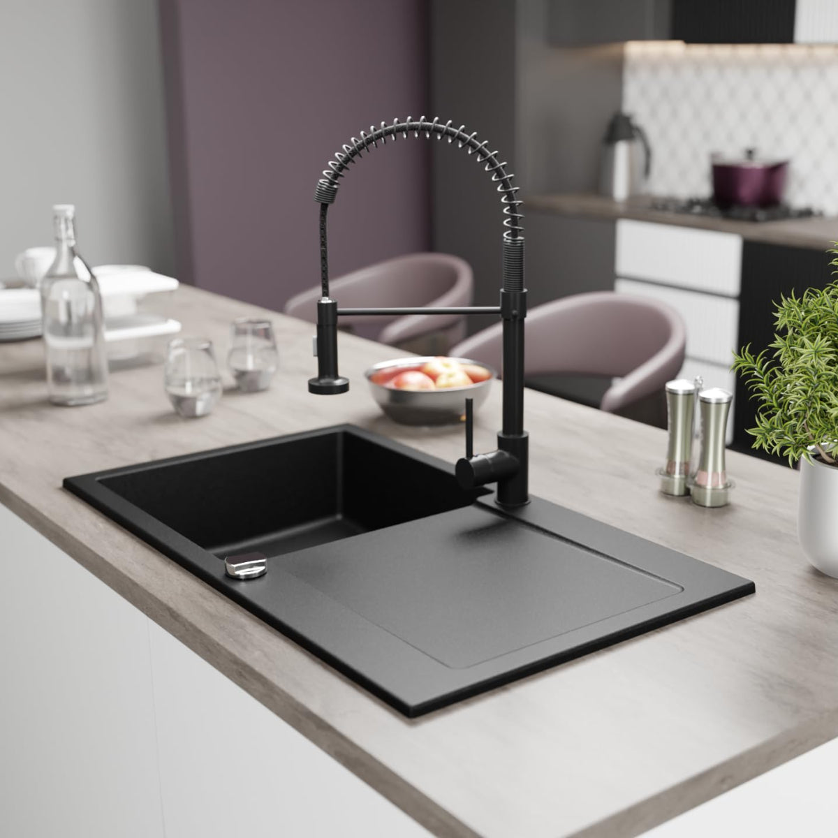 Diese Variante wird mit verschiedenen wählbaren Armaturen in Schwarz angeboten. Ob klassisch schlicht oder modern mit extra Funktionen – Sie wählen die Armatur, die perfekt zu Ihrer Küche passt.