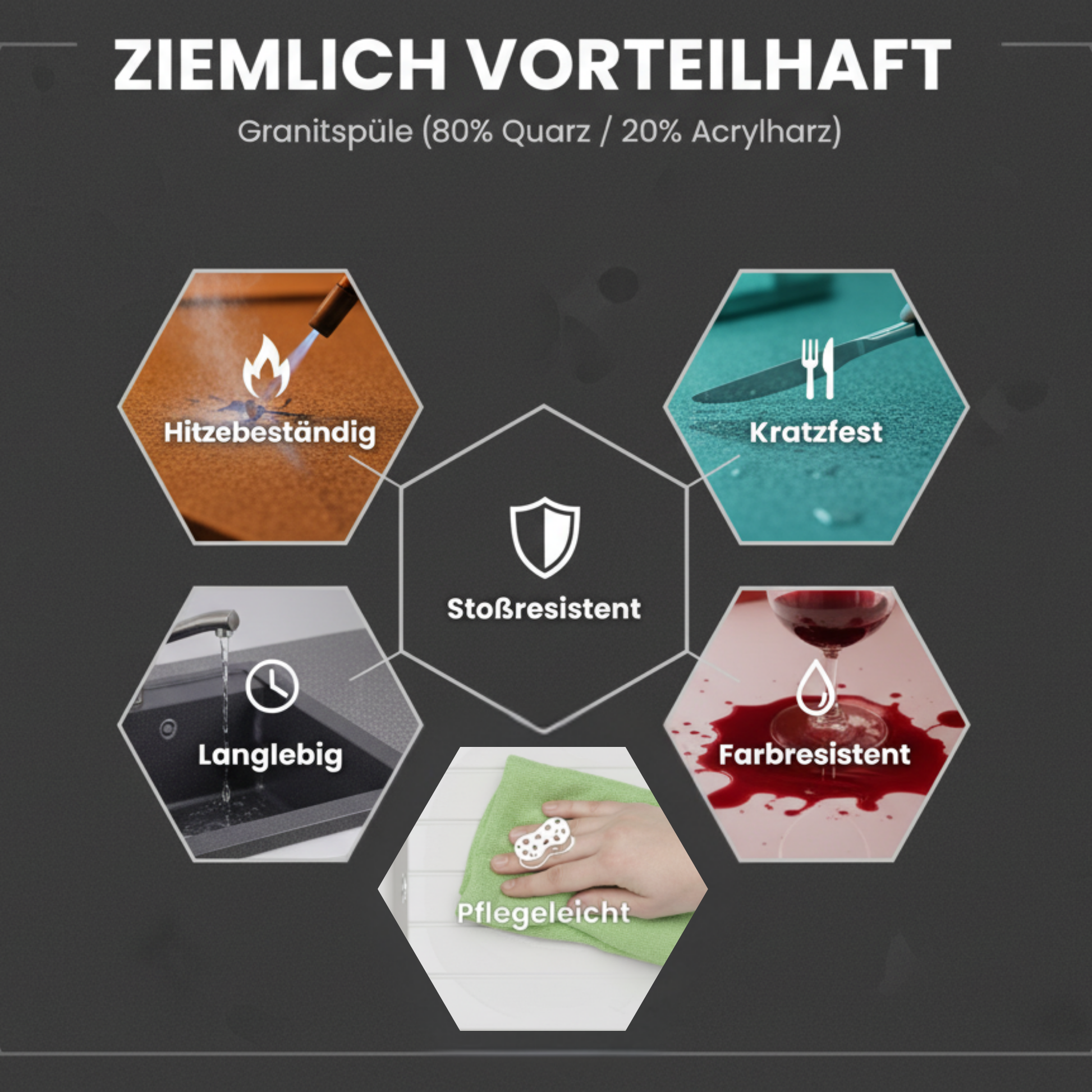 - Material: 80 % Quarz, 20 % Acrylharz