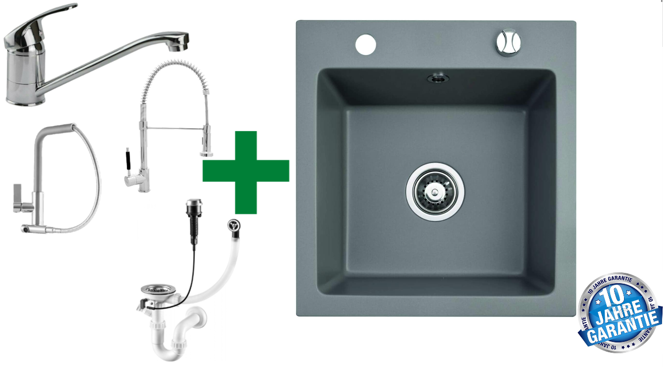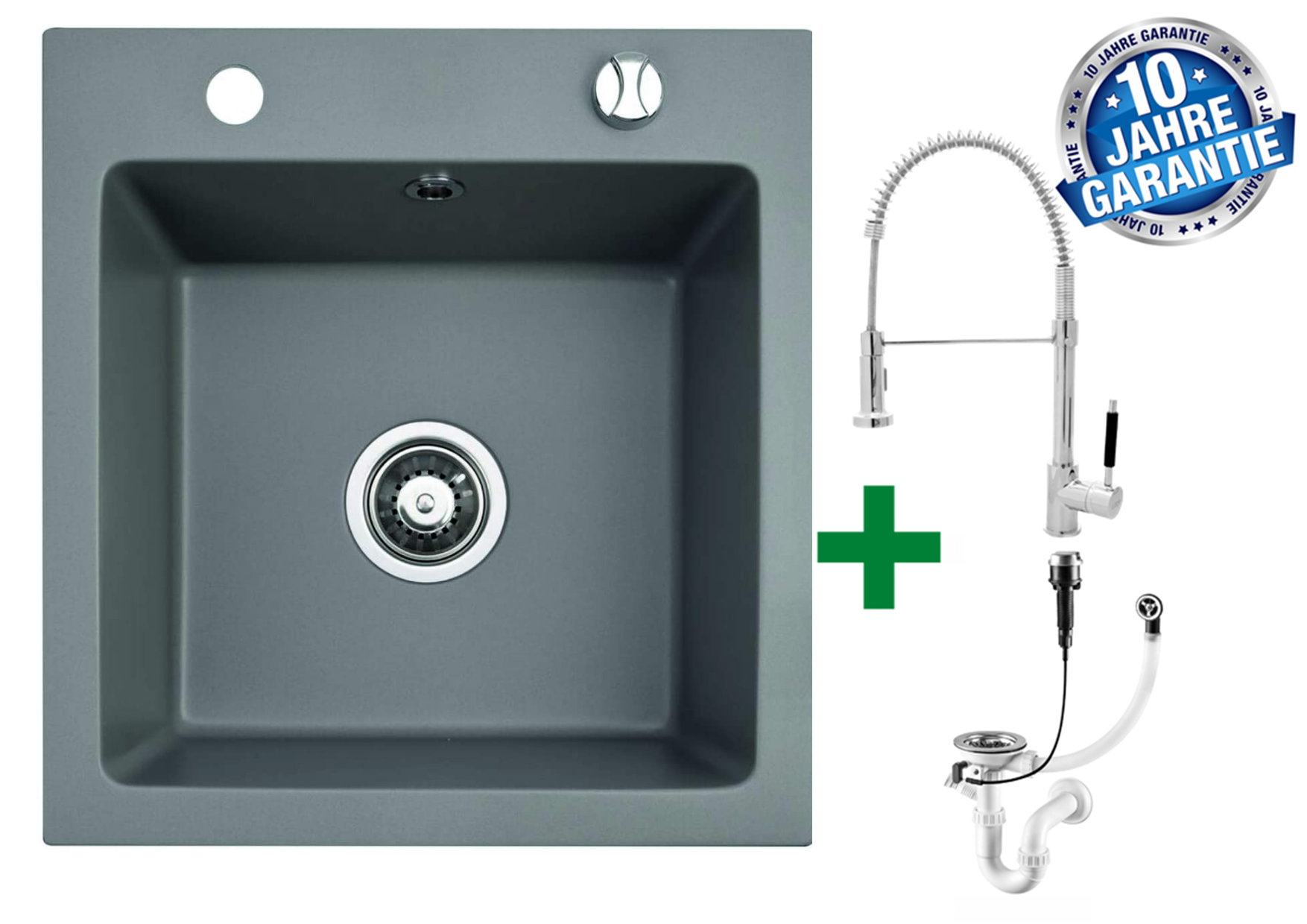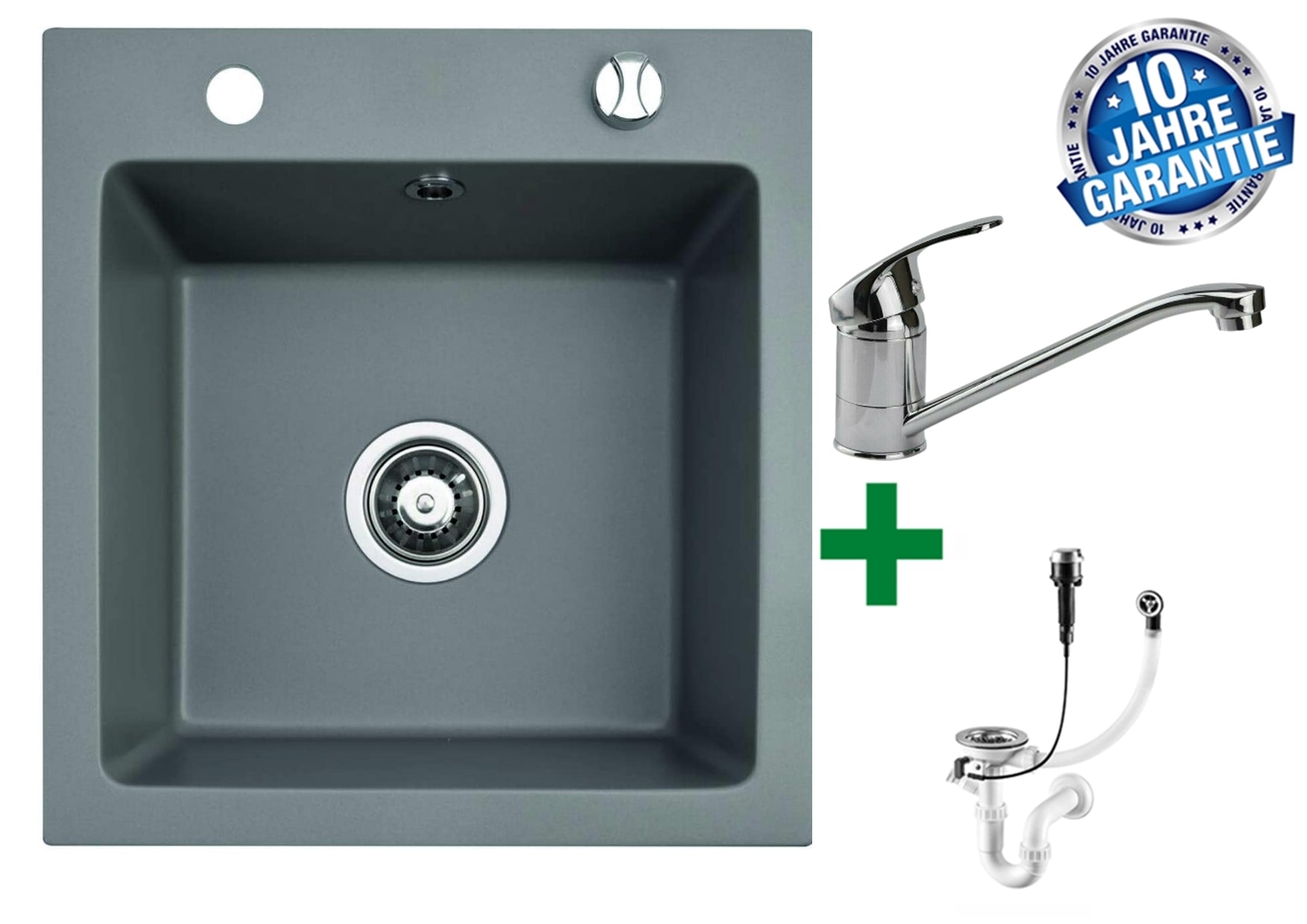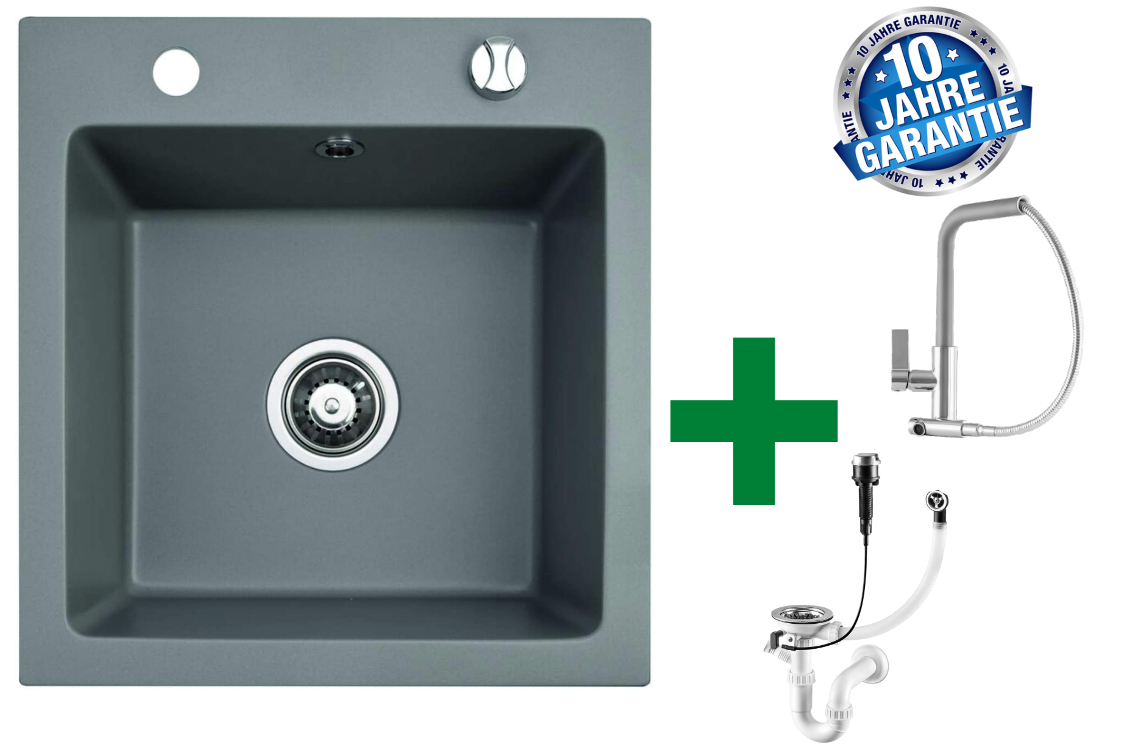 Granitspüle 48x50 Grau + Armatur + Siphon