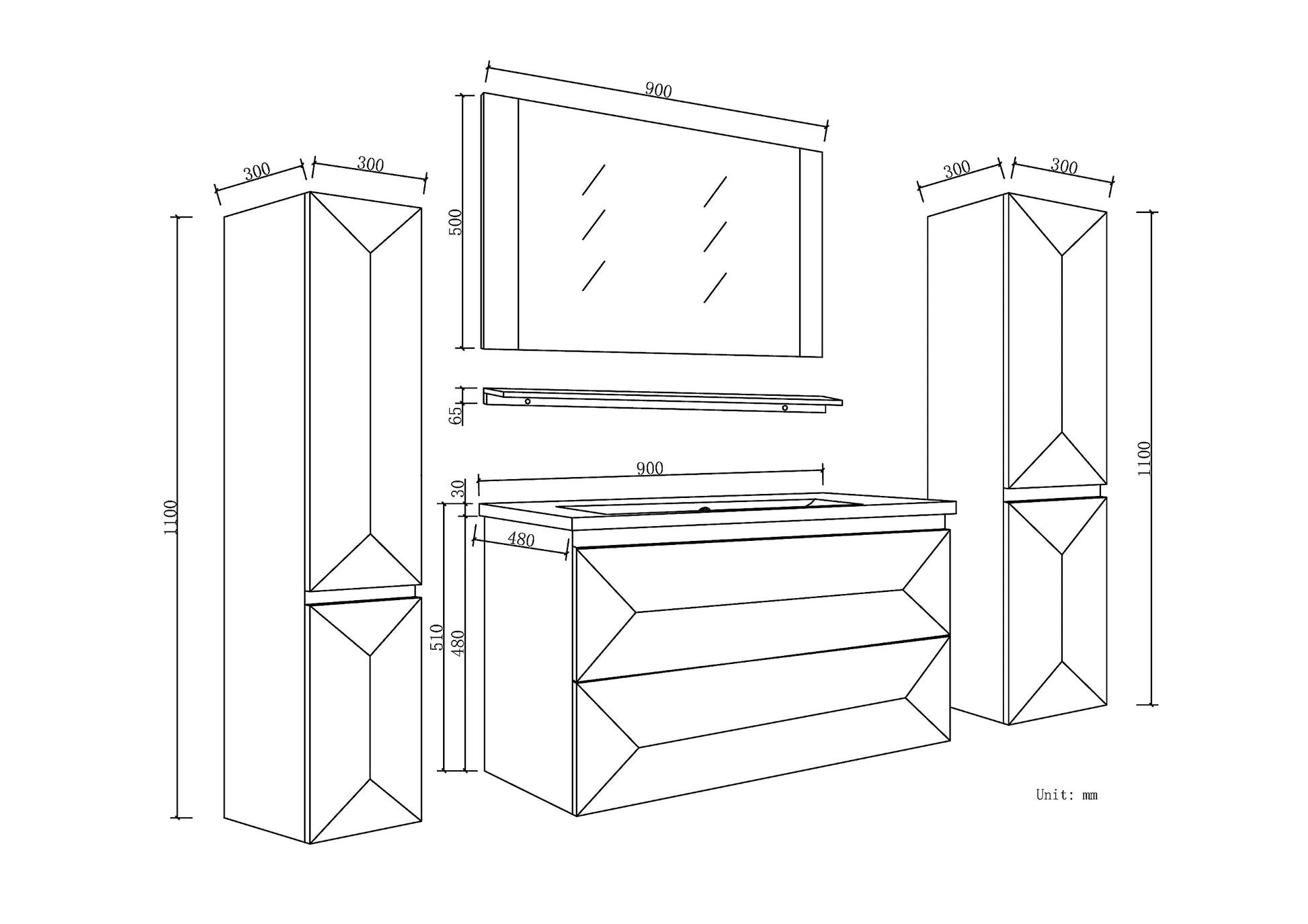 Der Waschtischunterschrank mit Soft-Close-Mechanismus schließt sanft und geräuschlos und bietet Platz für Badutensilien des täglichen Bedarfs. Ergänzt wird das Set durch zwei praktische Seitenschränke, die zusätzlichen Stauraum für Handtücher, Pflegeprodukte oder Reinigungsmittel schaffen.
