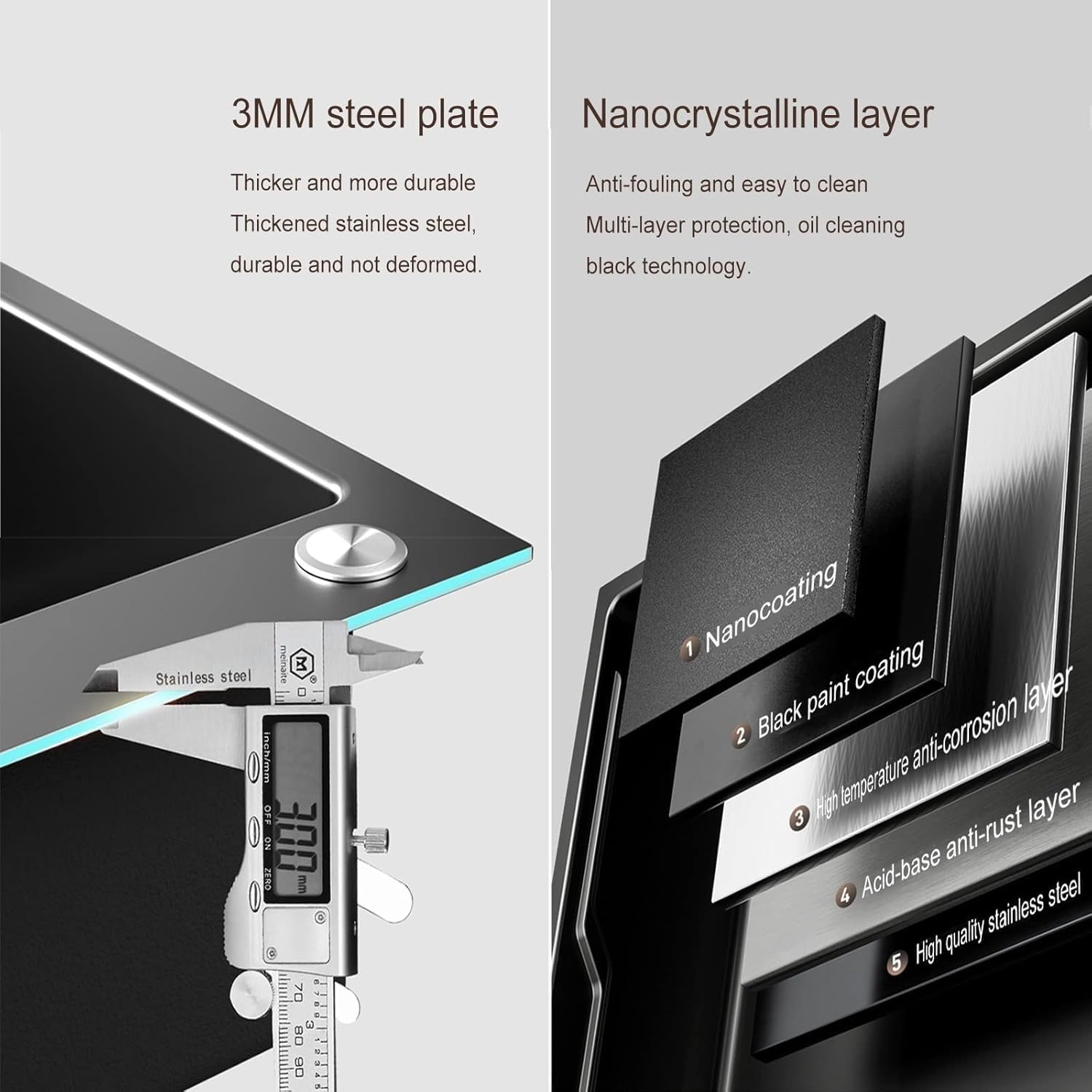 Zusätzlich widersteht die Spüle extremen Temperaturen von -18°C bis +280°C. Extra dicke Stahlwände (3 mm + 1 mm) sorgen für maximale Stabilität und Widerstandsfähigkeit. Die spezielle Anti-Kondensations-Beschichtung schützt vor Feuchtigkeit und Kondenswasserbildung.
